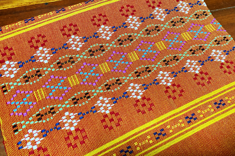 3種の模様を織り込むのが特徴で「ジンバナ(銭花)」は裕福になるように、「オージバナ(扇花)」は子孫繁栄、「カジマヤーバナ(風車花)」は長寿というように、それぞれに意味が込められている。